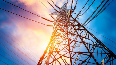 High-voltage pblems tower against the sky at sunset, power grid concept. High contrasting colors, stock photo, --chaos 30 --ar 16:9 --v 6.1 Job ID: fefbc0d2-9743-4ff9-b5c7-e09e92230f48
