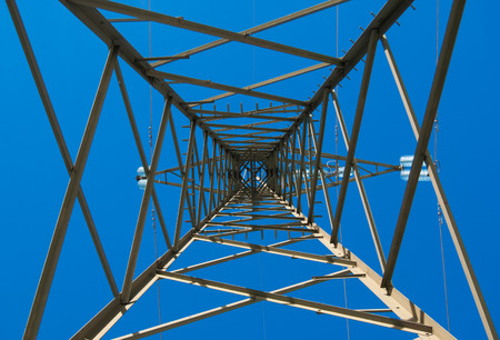 Looking up through an electricity pylon, creating a geometric perspective against a clear blue sky