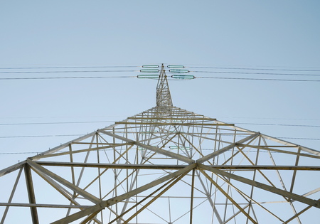 A power line tower against a clear blue sky, representing the reliability and stability of electricity as an essential resource.