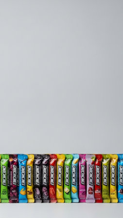 This vibrant image showcases colorful chocolate bars with nuts and candies arranged on a bright background, perfect for food photography and dessert themes.