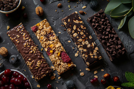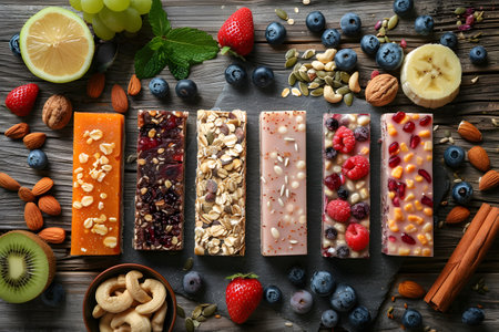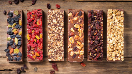 A vibrant display of assorted healthy snack bars featuring nuts and dried fruits, beautifully arranged on a natural wooden surface, perfect for nutritious snacking.