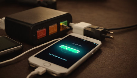 A white smartphone is connected to a black multi-port charging hub, with its screen displaying a bright green battery and charging animation. The charging hub has three distinct colored buttons or indicators (red, orange, green) and multiple ports. A white plug is attached to the hub, indicating it's plugged into a power source. The scene is set on a dark, textured surface, emphasizing the technology and the act of charging multiple devices simultaneously.