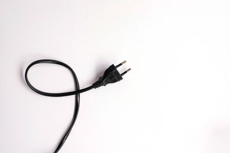 Black flat electrical plug with wire isolated on white background without nothing. The appliance is off. Electricity safety precautions. Close-up.