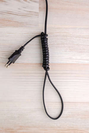 concept of energy dependence: hinge loop made of an electric cord with a plug, on a wooden background, selective focus