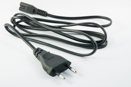 Electric European plug isolated on beige background. Black power cable with plug. Power cord close-up