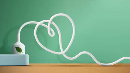 Clean Energy Power Concept. Close-up of White Power Socket. Green leaf Icon print on Electric Plug. Cable Wire as Heart Shape. World Earth Day, Sustainable Resources, Environmental Care