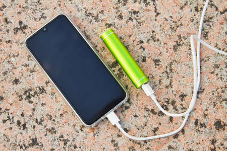 Smartphone and external power bank lie on the granite surface in the park while charging