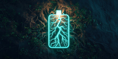 Lithium Ion Battery With A Lightning Bolt Icon, Roots Illuminated With Neon Teal Light Battery Shape On Dark Battery Shape.