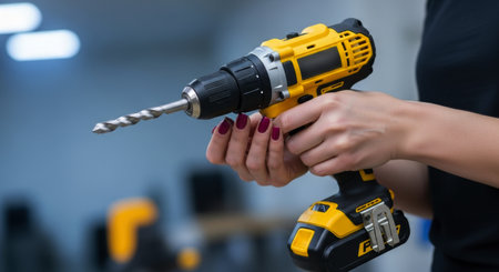 Woman hands firmly gripping a yellow and black cordless power drill with a sharp metal drill bit, ready for home improvement, construction, or repair tasks.