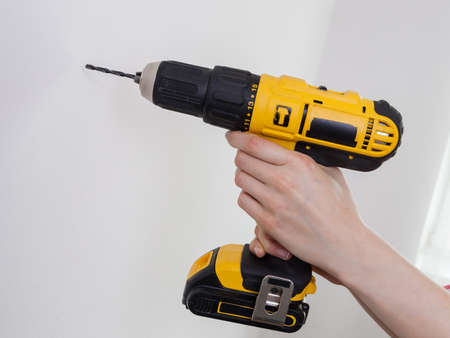 Soft focus on hand operating electric drill for white interior installation.