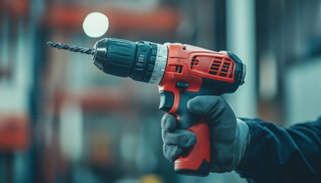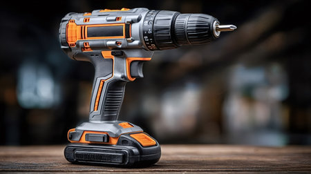 Modern cordless drill with a phillips head bit sits ready for use on a wooden workbench in a blurred workshop background, showcasing tools of the trade