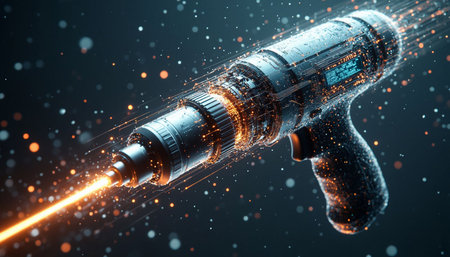 3D rendering of a laser-like tool on a dark background with sparks