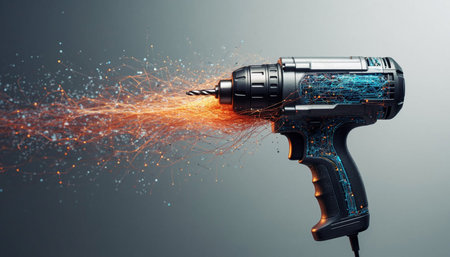 An AI generated illustration of an electric drill in a dark setting against a pitch-black background