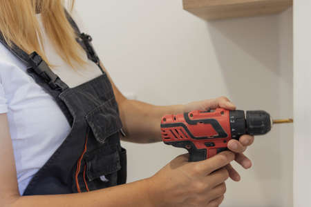 a beautiful girl of European appearance with blond hair in a black bandana, white t-shirt and in a special suit drills a hole in a white wall with a drill. The concept of equality and work
