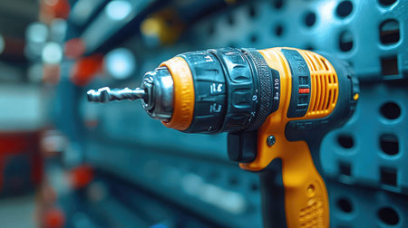 Close-up of a yellow electric drill against a blurred workshop background, showcasing tool detail and workshop vibe.