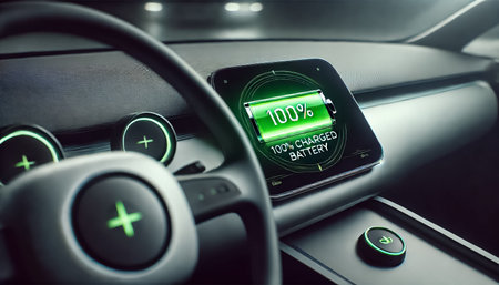 A conceptual image from the driver’s seat of an electric car, showcasing a dashboard with a glowing green 100% charged battery icon. The modern, minimalistic interior is softly illuminated, emphasizing the vehicle’s advanced technology and readiness for a journey.
