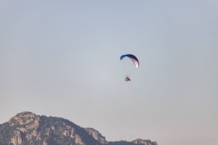 Paraglider flying over mountains near Kemer, a seaside resort on the Turkish Riviera in Antalya Province, Turkey