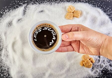 Woman holds a cup of coffee over a pile of sugar and the inscription on the drink less sugar. Diet and health concept.
