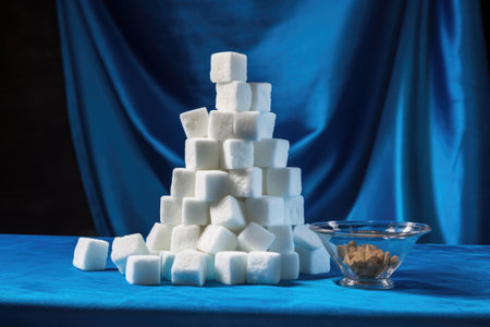 white and brown sugar cubes piled on a bright blue background. Neural network generated in May 2023. Not based on any actual scene or pattern.