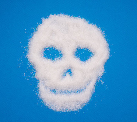 Sugar as harmful ingredient for eating - Heap of sugar in skull shape on blue textured background. High quality photo