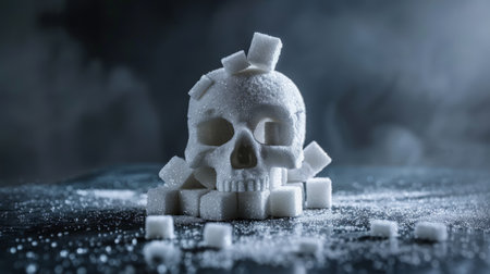 Frosty sugar skull on sugar cubes, artistically depicting the cold truth about sugar's impact on health.