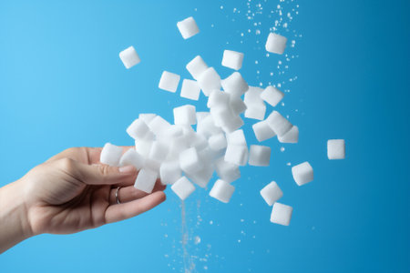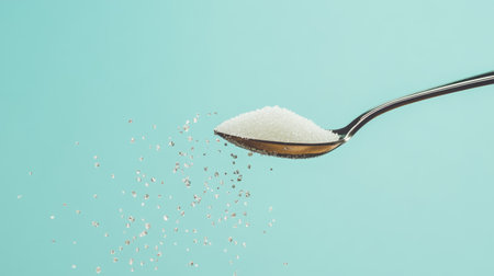Hand pouring sugar from a spoon, with sugar crystals falling, symbolizing the concept of sugar reduction, no added sugar, and a low sugar lifestyle for better health
