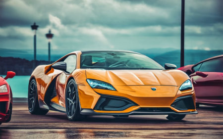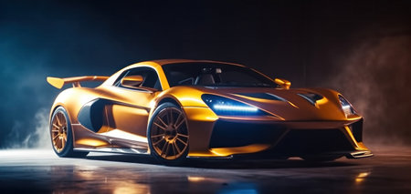 Luxury sports car in urban setting Automotive and success concept Sleek, high-performance sports car parked on city street at night, reflections of neon