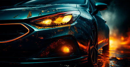 Generative AI, fiery explosion, and heavy black smoke in a sports automobile