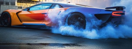 A vibrant orange and blue sportscar performs a burnout, kicking up a large cloud of blue smoke on an asphalt surface with a modern building in the background. AI-generated content