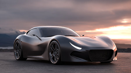 Sleek and Modern Car Against a Dramatic Sunset Landscape Backdrop