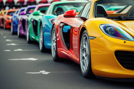 A line of vibrant sports cars zoom down a bustling street, creating a lively scene, Multicolored sports cars lined up and ready to blaze through the track, AI Generated