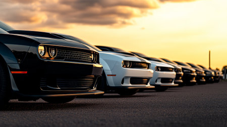 Rows of modern muscle cars parked in a dealership lot, basking in the warm glow of sunset, showcasing their sleek designs and powerful presence, ready for eager buyers