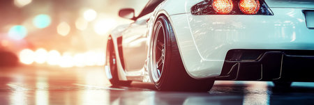 Shiny sports car speeds through wet rain, reflecting headlights generated by artificial intelligence
