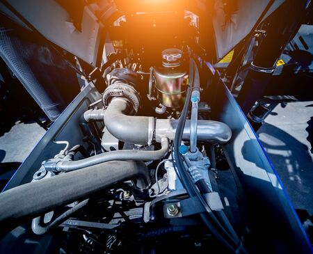 Modern new agricultural tractor engine. Machinery and equipment. Industrial details.