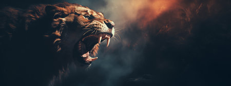 A detailed close-up of a lion showing its powerful open mouth. Perfect for wildlife enthusiasts and animal lovers.