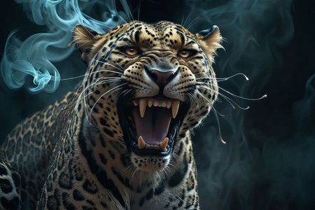 Closeup of a fierce black panther snarling with vivid detail on its fur and fangs
