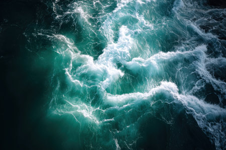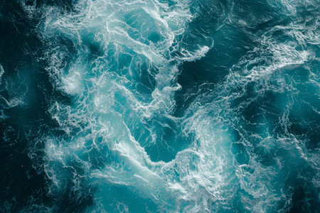 This image showcases a dynamic view of ocean waves, with swirling water patterns and rich textural details. The composition displays various shades of teal and white, suggesting a turbulent environment. Suitable for a range of uses, this photograph could be employed in various commercial and editorial contexts.