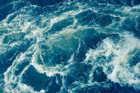Blue waves of water of the river and the sea meet each other during high tide and low tide. Whirlpools of the maelstrom of Saltstraumen, Nordland, Norway.
