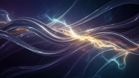 This abstract image captures electric currents creating glowing lines against a dark background, showcasing vibrant reflections and dynamic energy patterns.