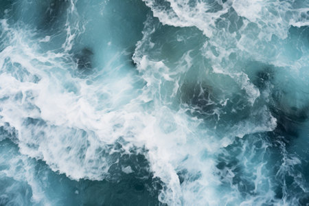 An ocean waves in motion with white foam patterns creating dynamic and energetic seascape from aerial view