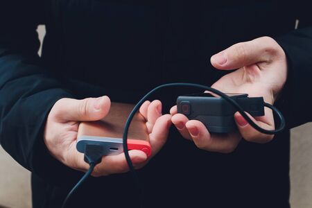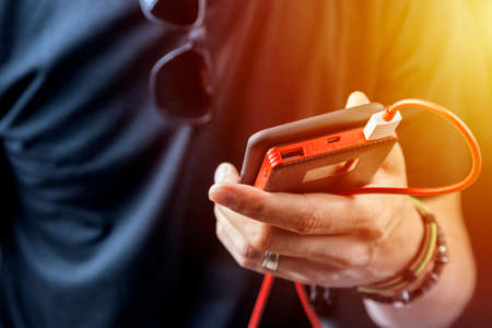 Man in black tshirt charging his smartphone with power bank, power unit. Focus on person hand and diveses.