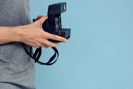 Photo camera in the hands of a man professional shooting lens technology studio equipment blue background