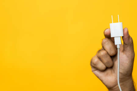 Close up male hand holding ac/dc adapters smartphone recharge supply.
