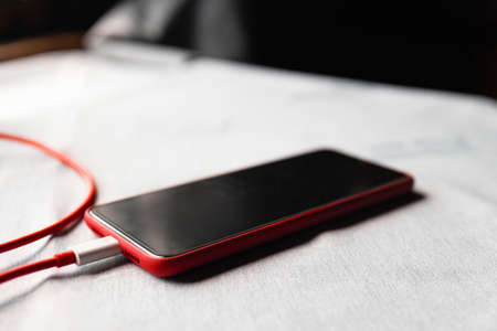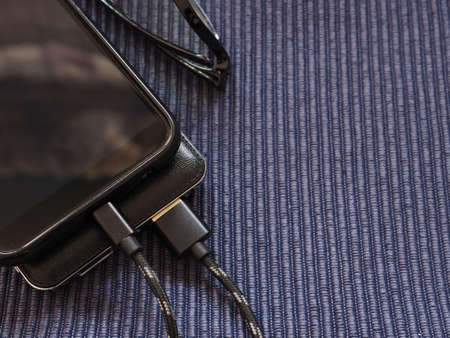 Mobile smartphone charging battery close-up on office table