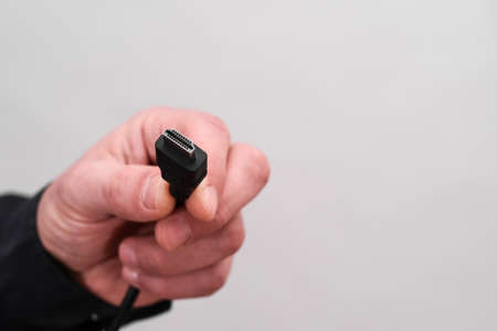 HDMI plug in hand on white background.