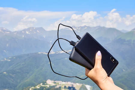The girl charges the smartphone on the background of the mountains using a power bank