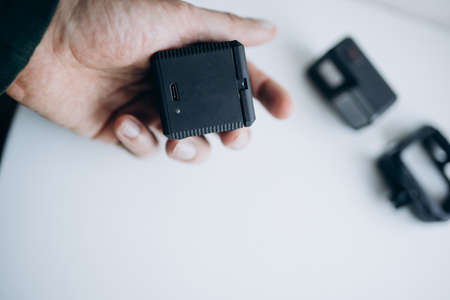With the help of an external battery, the battery for the camera is being charged.