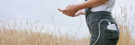 Panoramic web banner Power bank in the back pocket of a girl in a yellow field charges the phone, against the background of ears of wheat and sky, rear view of a young beautiful woman.