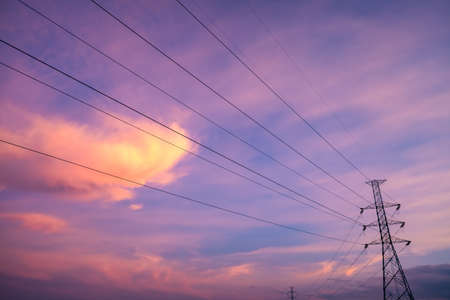 High voltage tower of colorful sky at evening