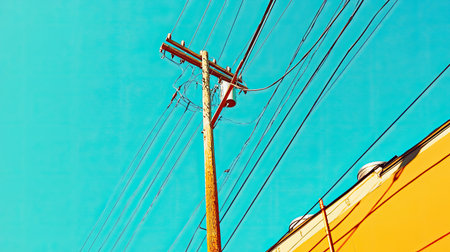 A visually striking image showcasing a utility pole with intersecting power lines against a backdrop of a clear blue sky and a bright yellow building.